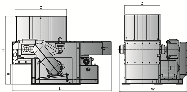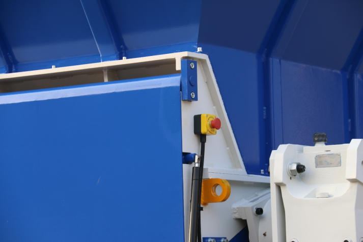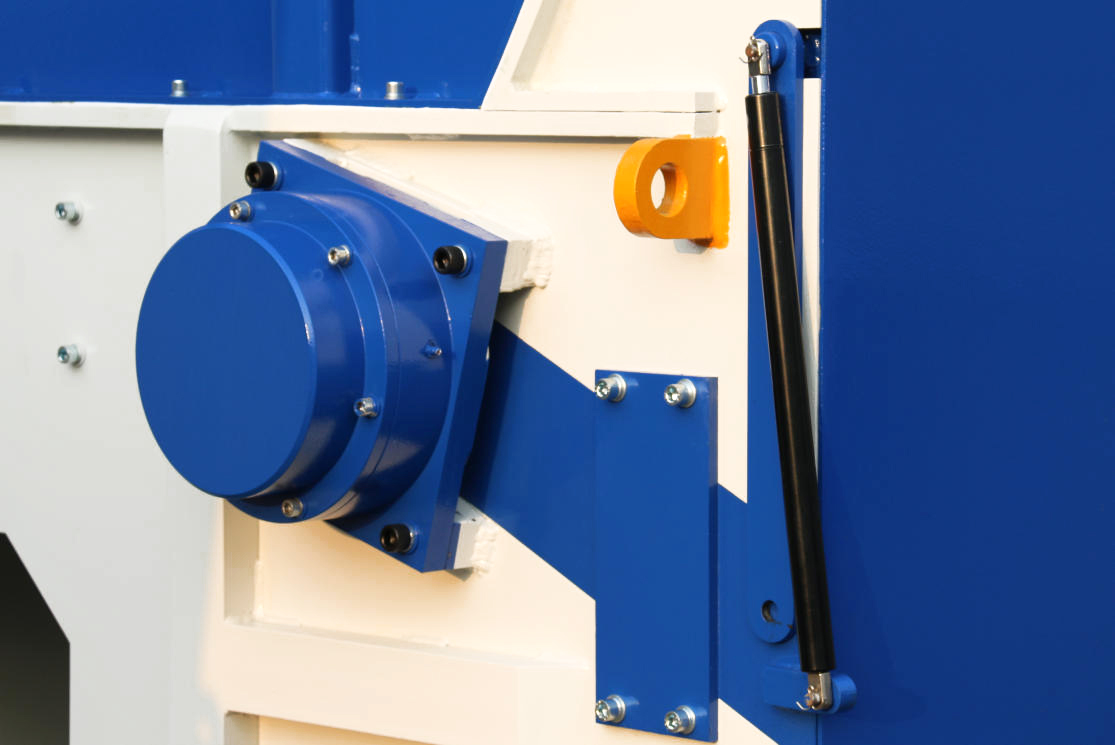 A horizontal hydraulic ram with a serrated pusher face feeds the material into the rotor. The ram is driven by an independent hydraulic power pack and can cycle automatically according to load or be controlled manually when required. A shock-protected hydraulic circuit ensures stable, continuous feeding of bulky and long parts while protecting the ram for a longer service life.