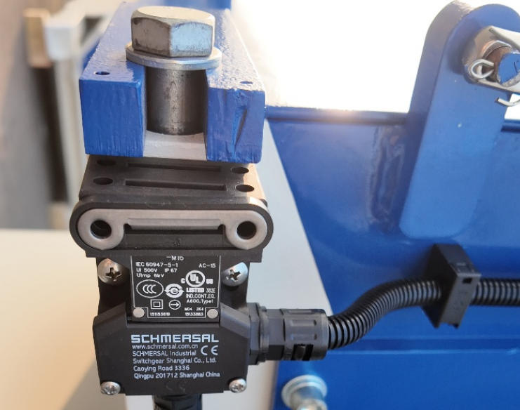A side-mounted emergency stop, fixed guards around all moving parts, and interlocked access doors with tongue-operated safety switches; opening any guarded area immediately cuts power and prevents accidental contact with moving parts during operation or maintenance.