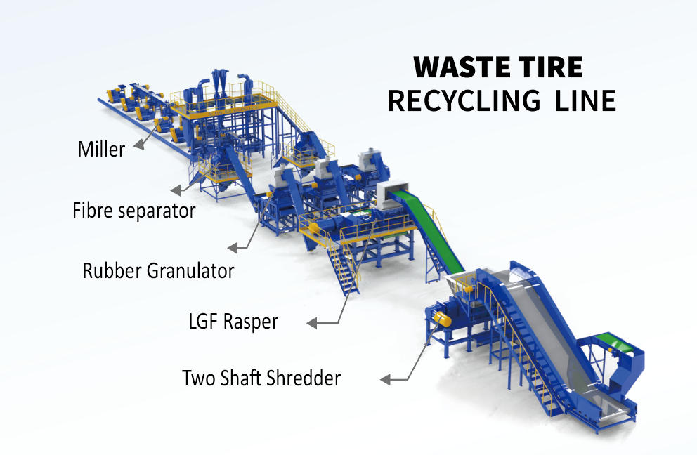 Waste Initiatives offers tyre recycling systems capable of processing a range of output sizes, including tyre-derived fuel (TDF), tyre crumb, and rubber powder.